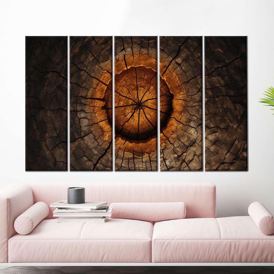 Impression sur toile abstraite élégante motif anneaux d'arbre pour décoration intérieure moderne, 5P : encadrée