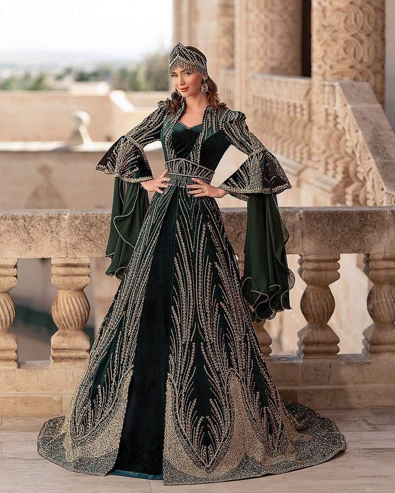Elegant Turkey Traditional Satin Floor-Length Beaded Floral Print Bridal Dress Natural Premium Quality Handcrafted Design