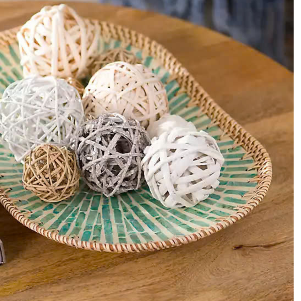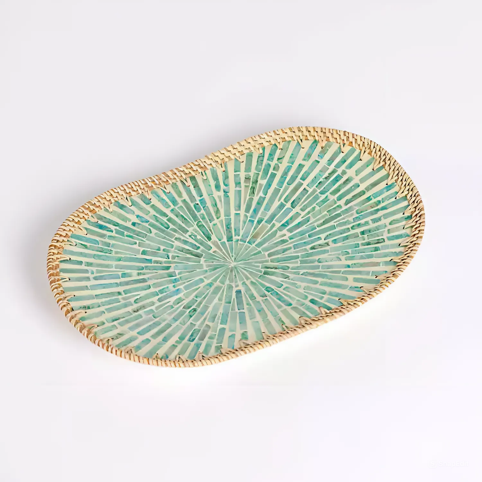 Plateau décoratif élégant en nacre turquoise et rotin pour affichage de boissons et de thé dans un décor de table à manger du Vietnam