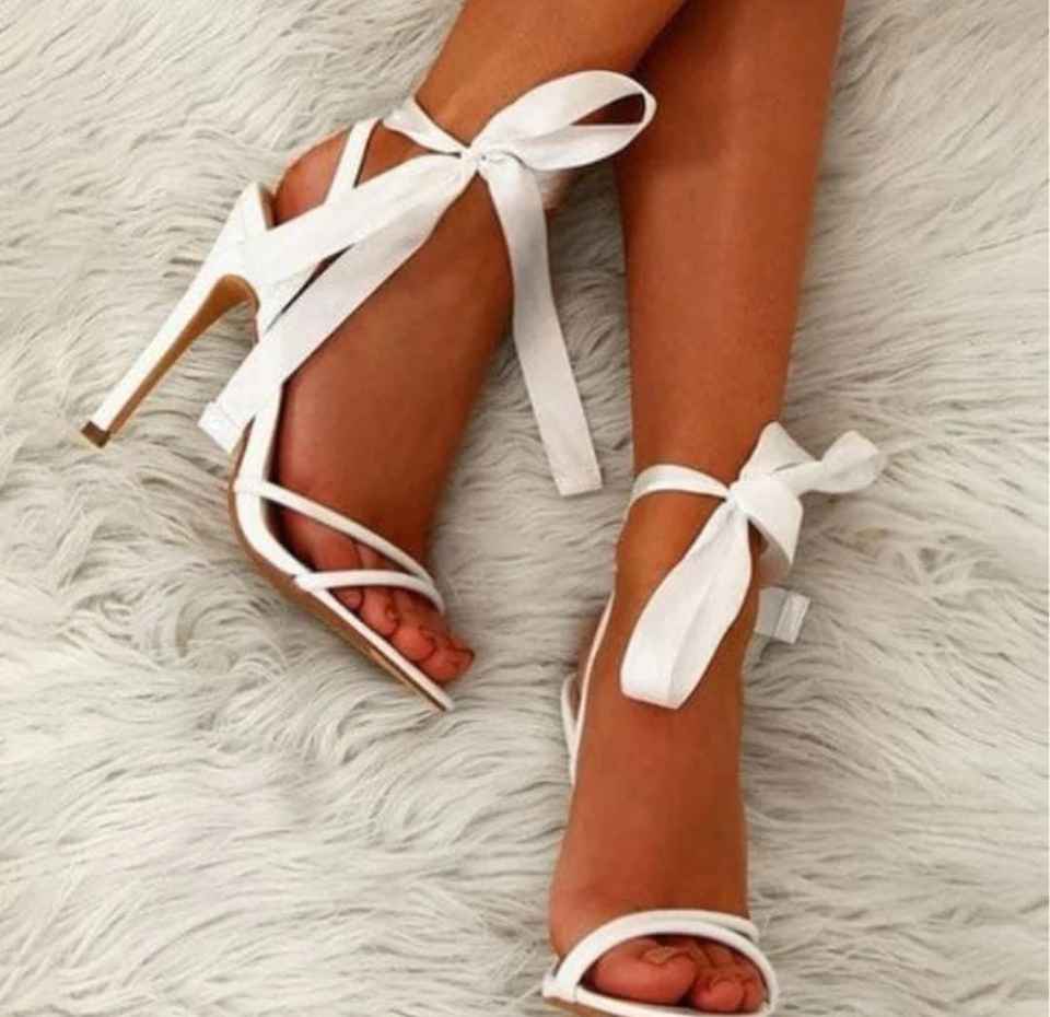 Sandales élégantes à bout pointu et ruban blanc | Chaussures de mariage princesse à talons hauts de 4 pouces | Escarpins de soirée de luxe blancs unis à bride arrière