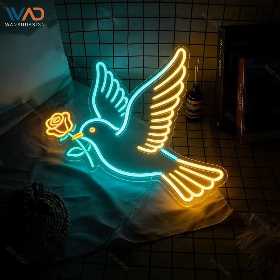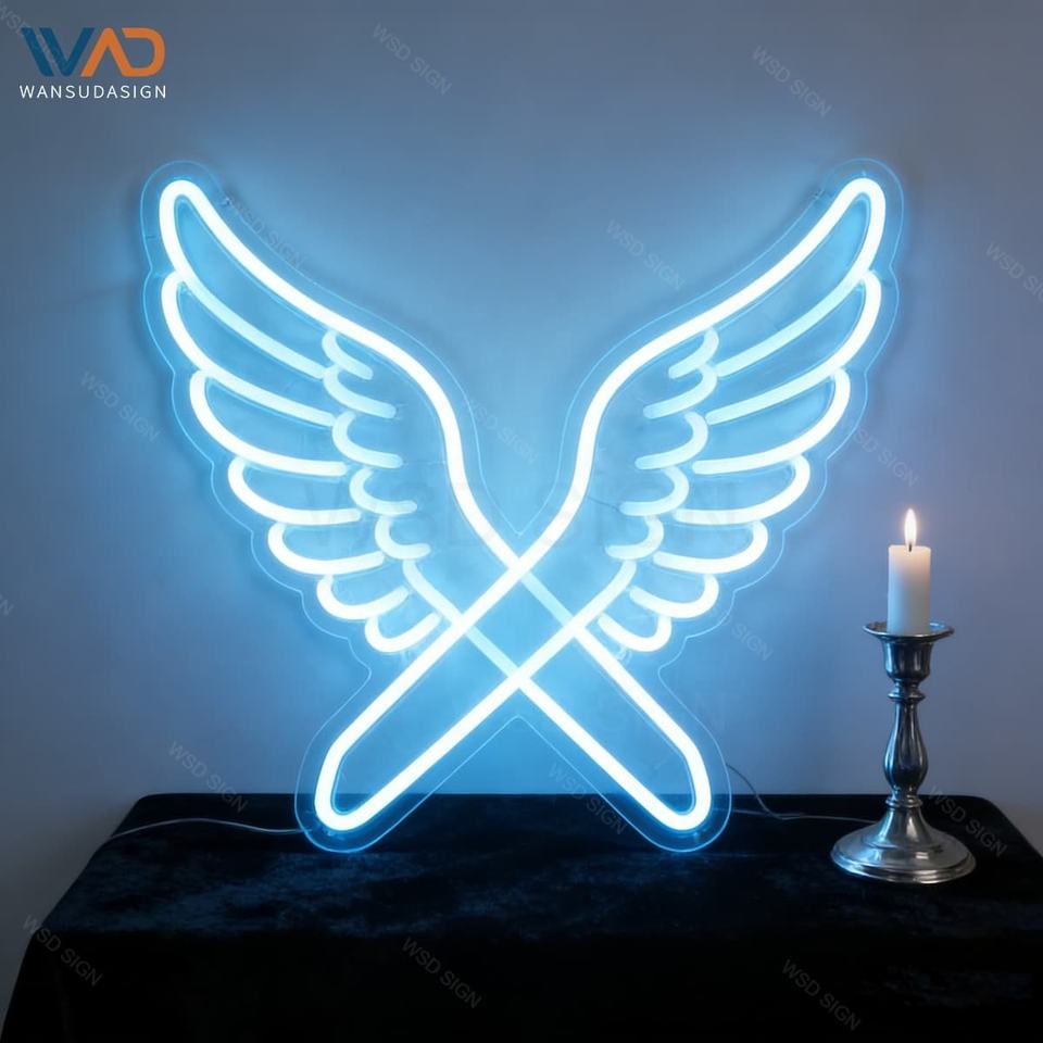 Enseigne néon élégante en forme d'ailes, symbole pour les chambres, les bureaux et les espaces artistiques