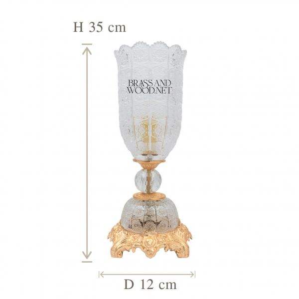 Elegant golden brass and crystal decorative vase with ornate carved base and intricately designed transparent glass body
