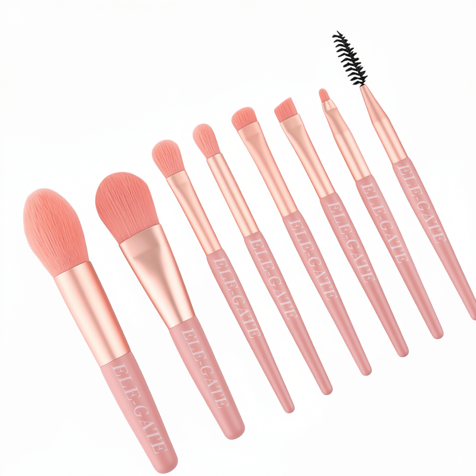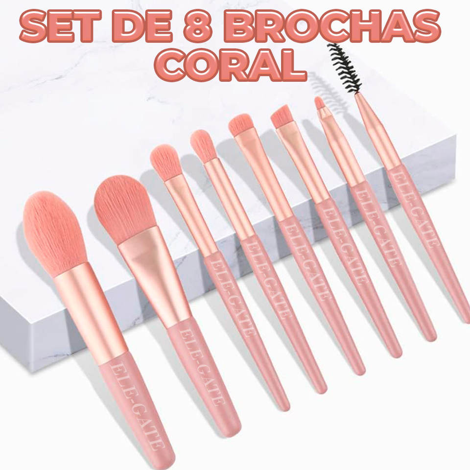 Ensemble de 8 pinceaux de maquillage professionnel pour le visage Elegate, avec poils synthétiques, manche en plastique, forme ronde, logo gravé au laser, corail Pi
