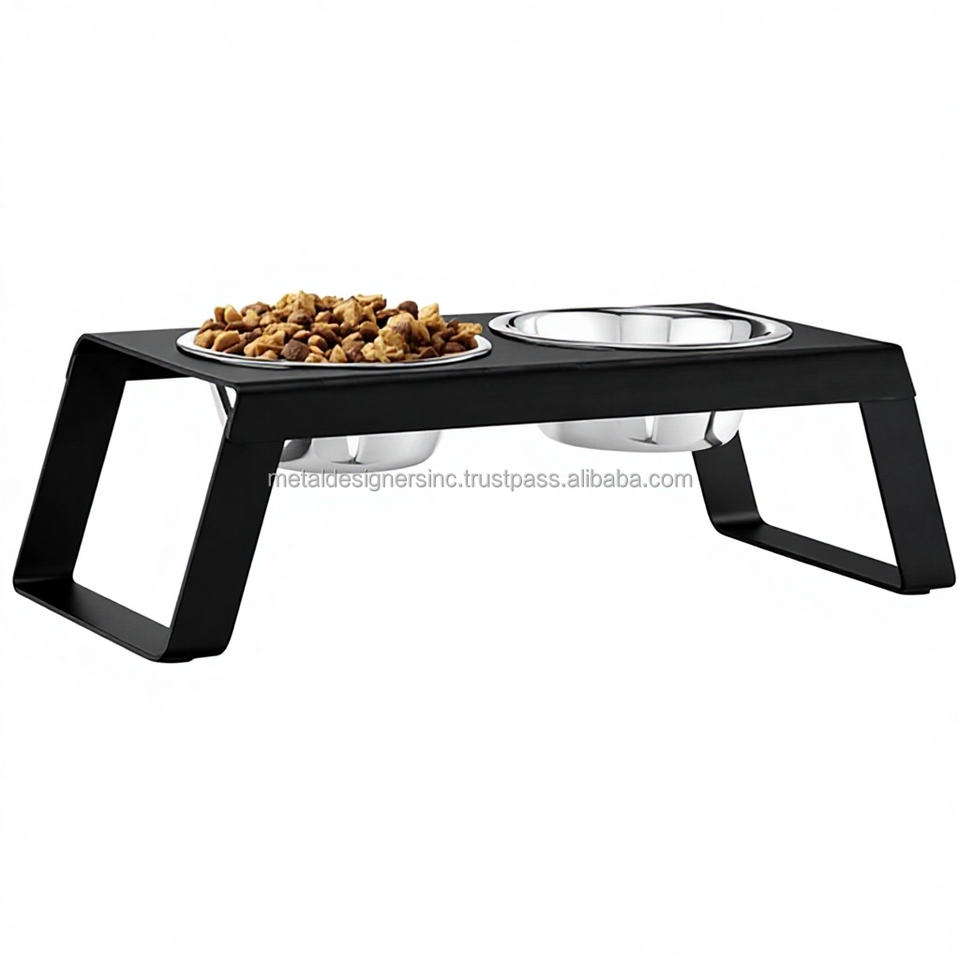 Double support d'alimentation pour animaux domestiques, avec 2 bols en acier inoxydable, Style de maille métallique, bois et noir, manga naturel