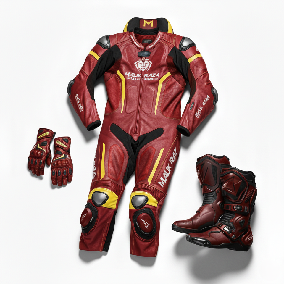 Ensemble d'équipements de course de moto professionnels de la série Elite | Combinaison en cuir sur mesure de niveau CE 2, bottes de course et gants de protection