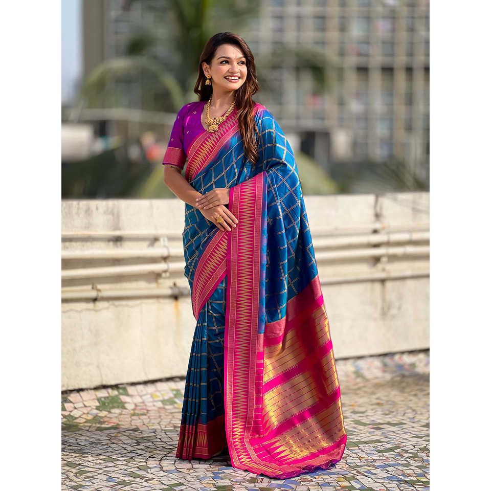 Elite Weaves Blue Soft Silk Checks Saree with Traditional Zari Contrast Woven Elegant Club Dress