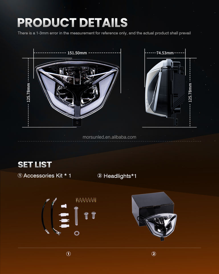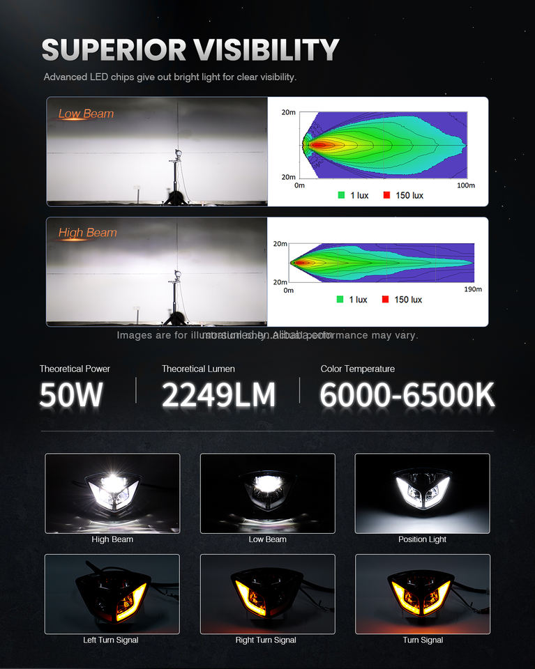 Lumen théorique:2249lm@Feux de route, 1412lm@Feux de croisement, 235.2lm@Clignotant