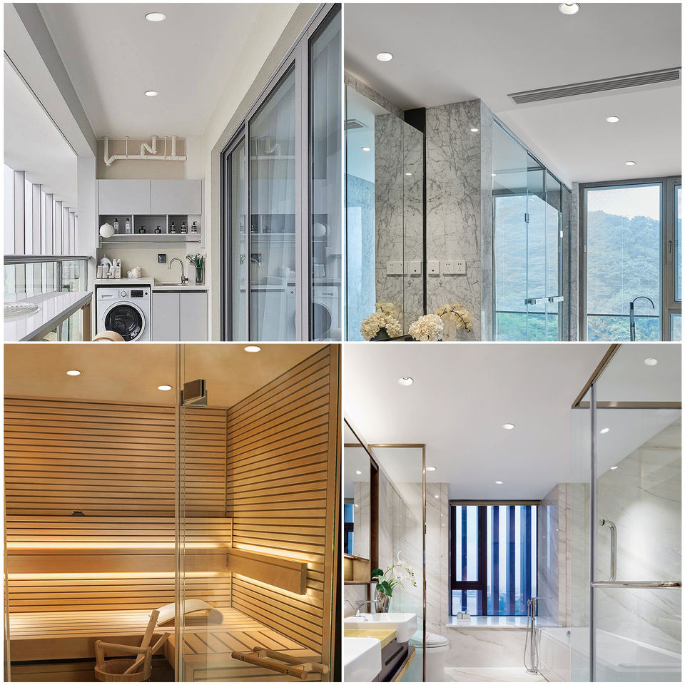 Projecteur encastré LED étanche en aluminium avec ouverture de 75 mm, disponible en modèles 8W/12W, idéal pour les salles de bain et les cuisines