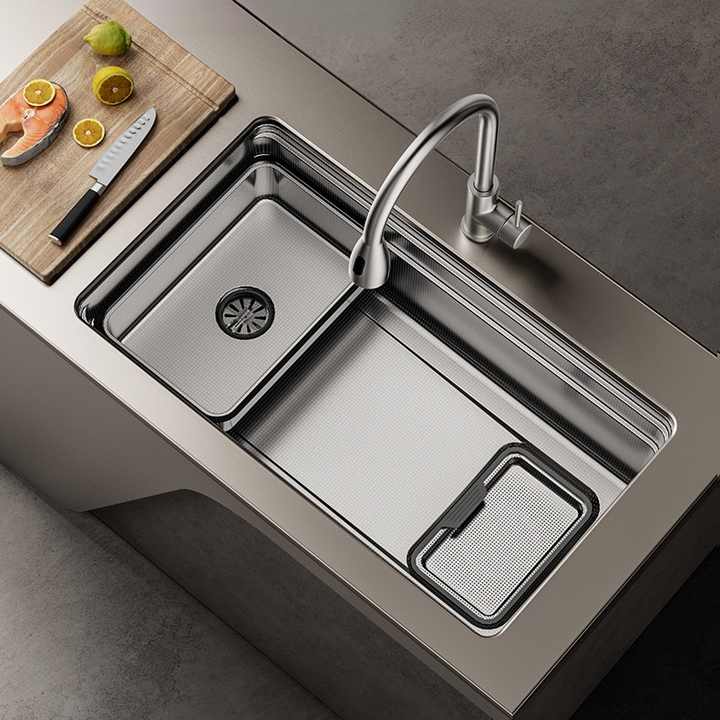 Évier de cuisine multifonctionnel en acier inoxydable SUS304 gaufré, grand bac unique, design à escalon, pour montage en surélevé