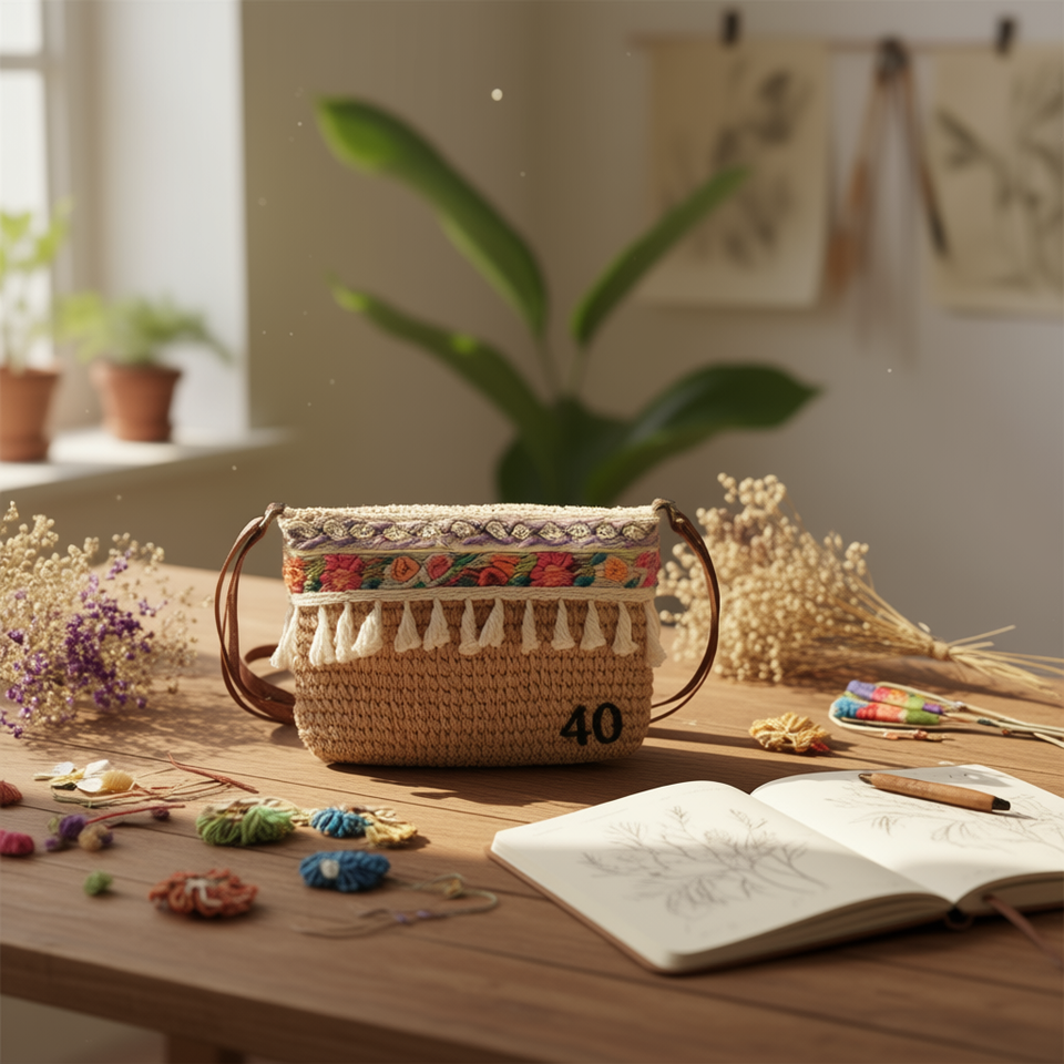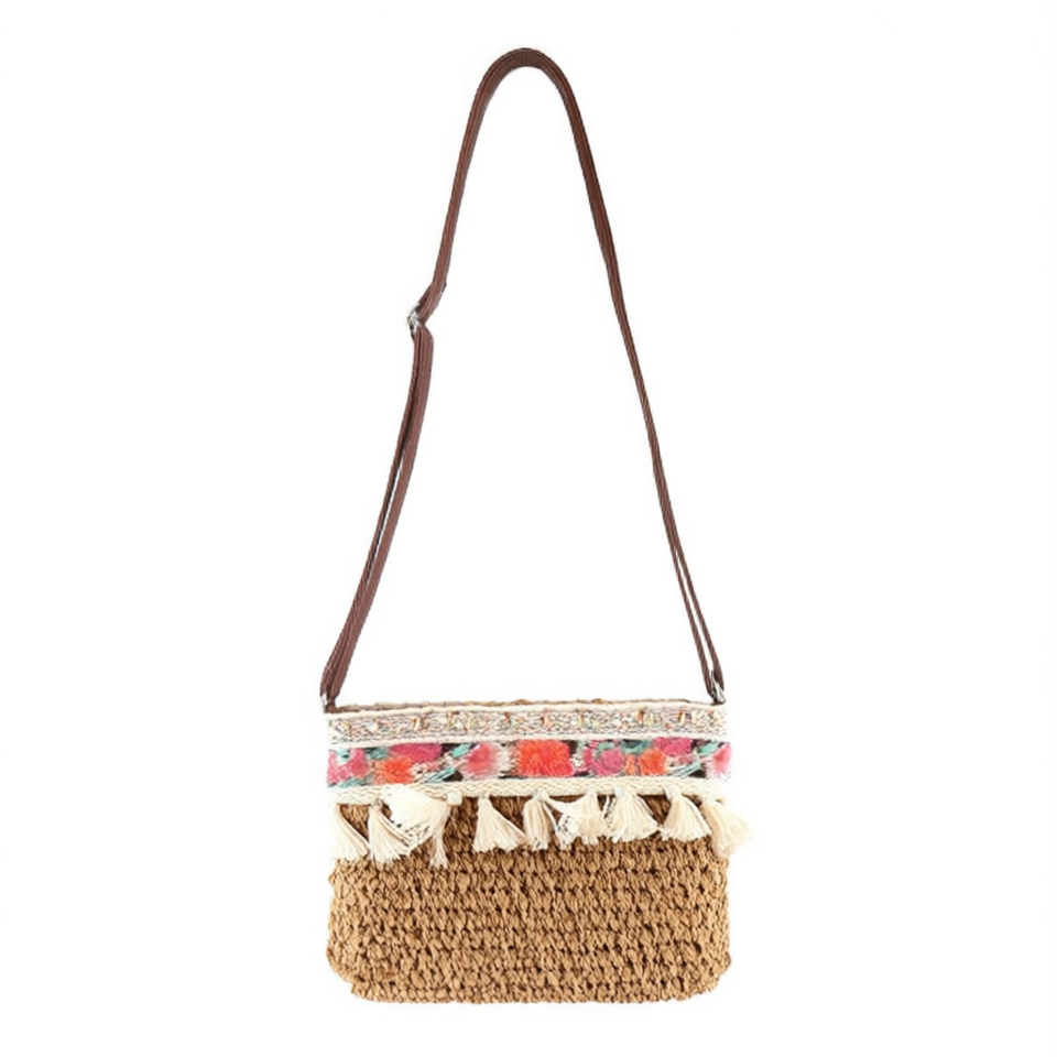 Sac bandoulière en papier tissé, décoré de franges brodées, 25*17CM