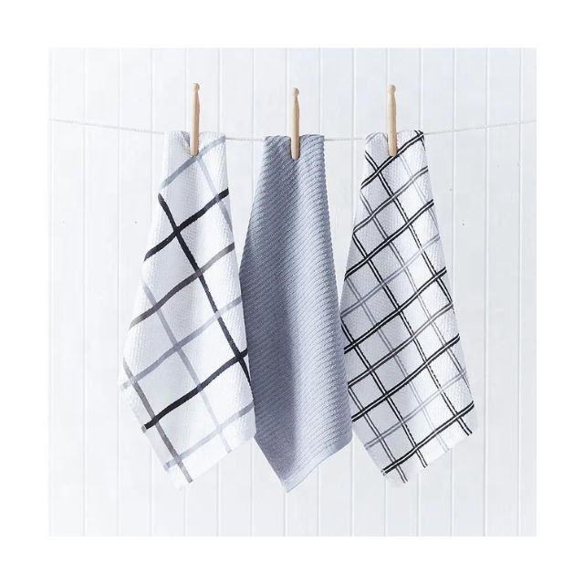 Serviettes de cuisine en microfibre à carreaux gris brodées, chiffons de nettoyage ménager, pour acheteurs en gros OEM