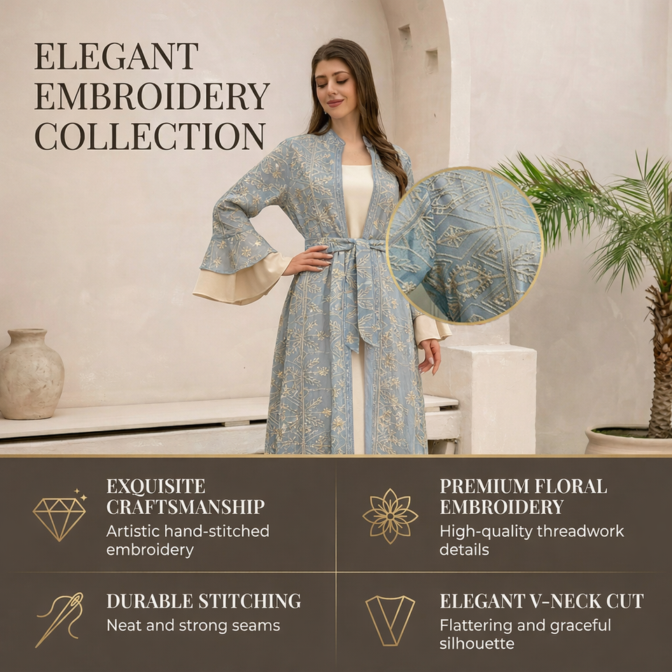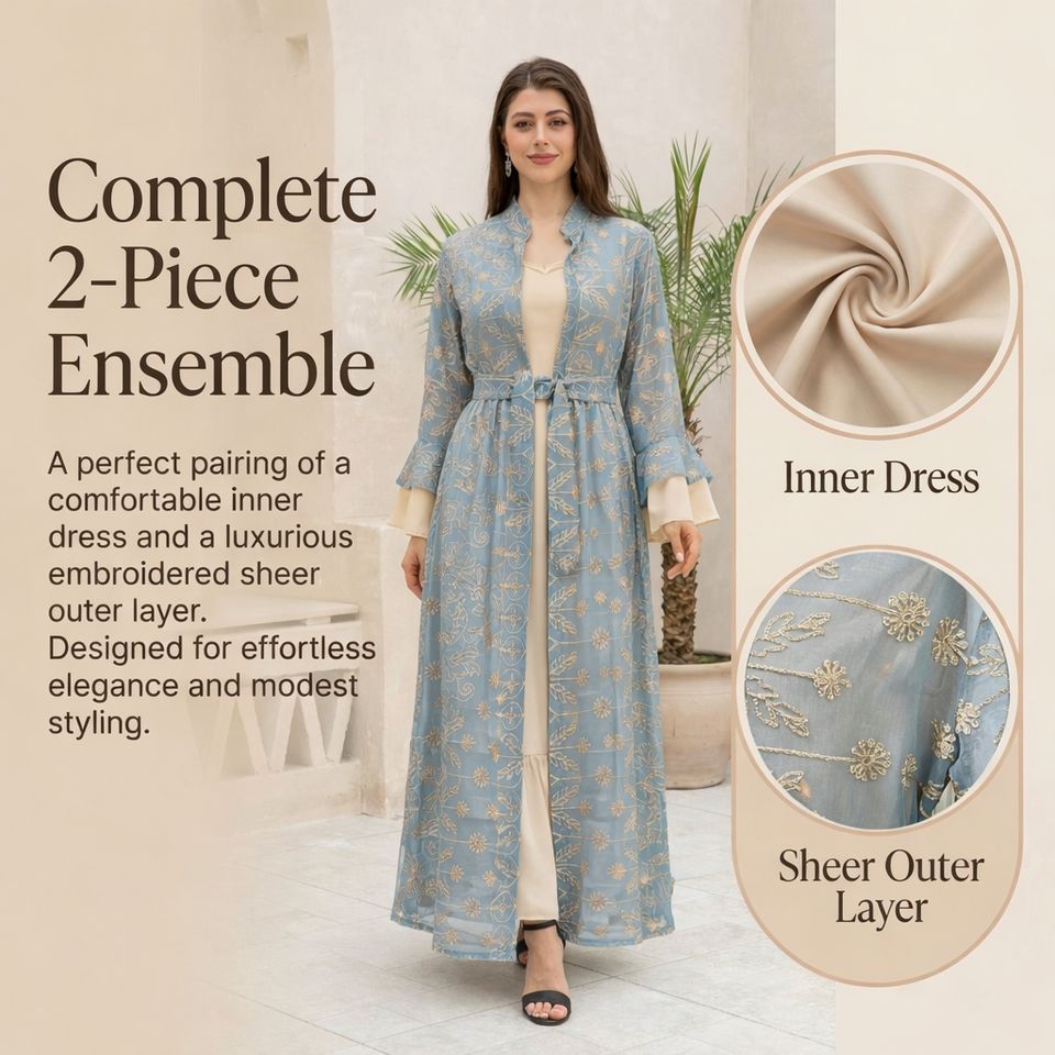 Ensemble Abaya Brodé Ouvert sur le Devant pour Femme avec Ceinture, 2 Pièces, Robe de Soirée Modeste à Marque Privée, Aïd