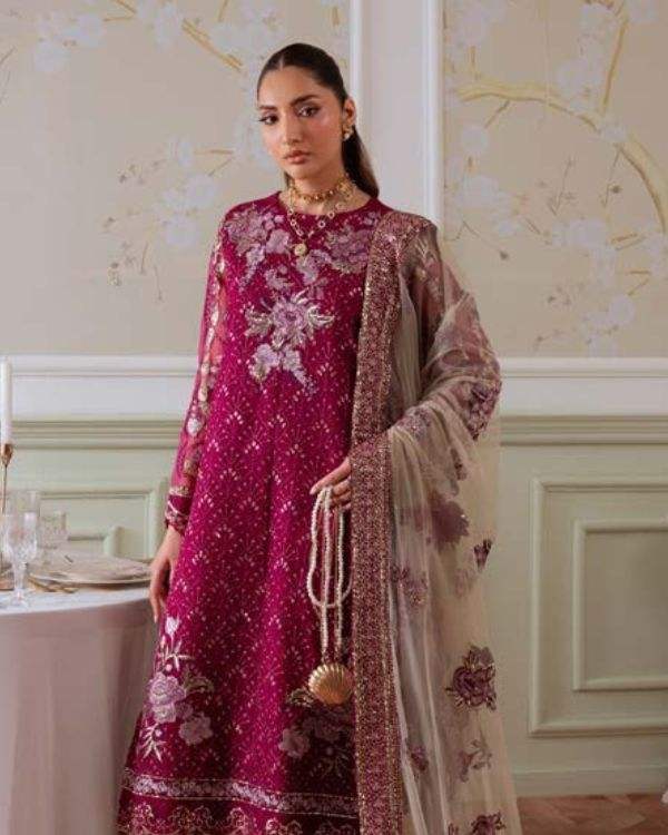 Pantalon en organza brodé à l'arrière Dupatta 4 côtés Bordures teintées à l'intérieur