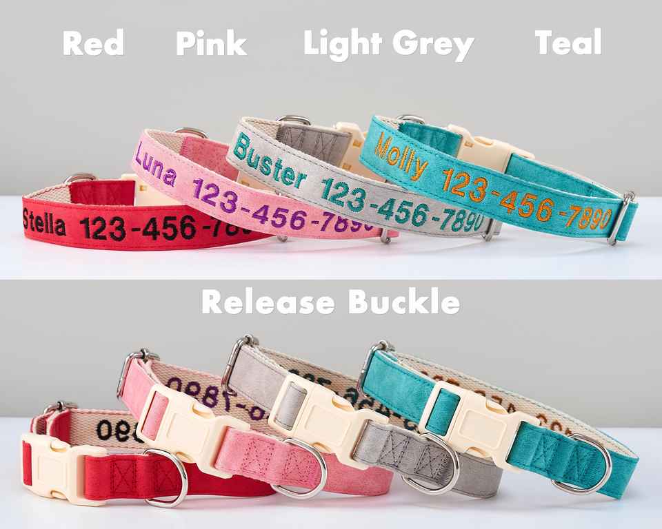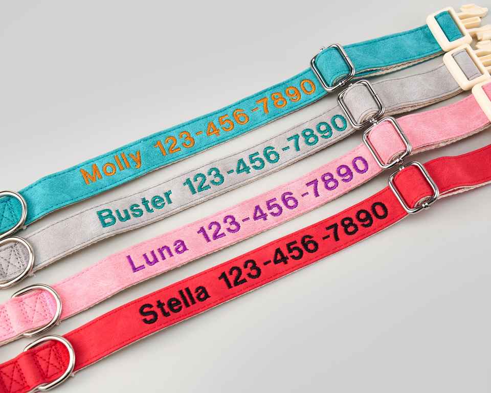 Embroidered Teal Suede Leather Dog Collar, Personalized Name & Contact Info, Adjustable Multi-Color Collar With Leash For Pet