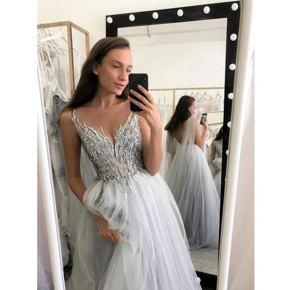 Name product:Grey wedding dress blends soft tones with intricate floral details
