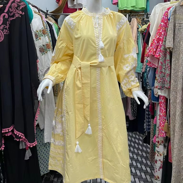 Robe longue décontractée bohème pour femme 100 % coton, col en V, broderie, manches courtes, lavable, taille naturelle, poches tissées