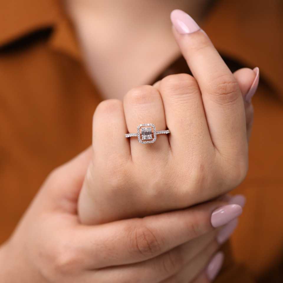 Bague de fiançailles en diamant de laboratoire taille émeraude avec halo de diamants baguette et ronds LR1066
