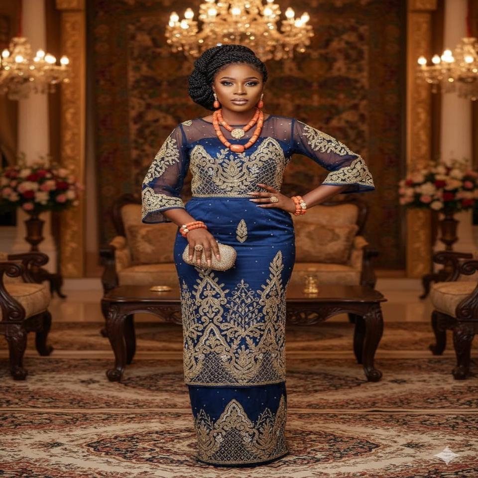 Emerald Goddess Luxury Nigerian Navy Blue George Wrapper With Elegance Floral And Leafy Hand Work Design For Nigerian Wedding