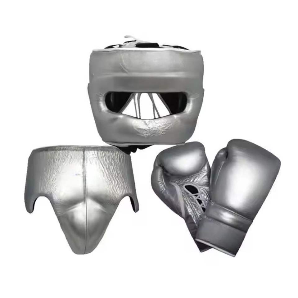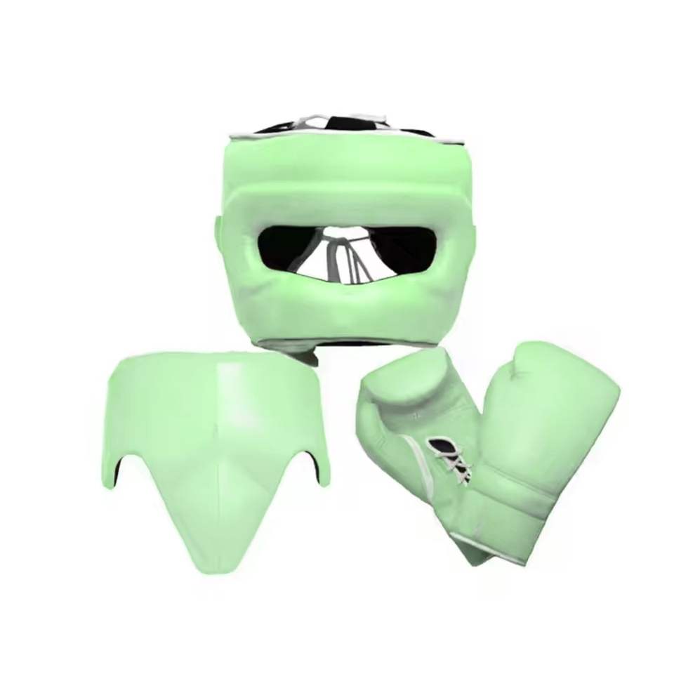 Ensemble de protection de boxe vert émeraude, équipement professionnel de sparring en cuir, casque, gants, protège-guêtres, ensemble de boxe 3 pièces