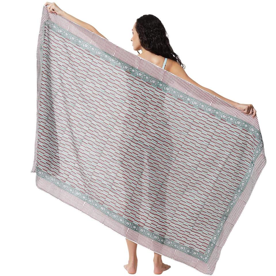 Sarong en coton imprimé à la main vert émeraude et rouge baie pour femmes, léger, idéal comme paréo de bikini, tenue de plage estivale
