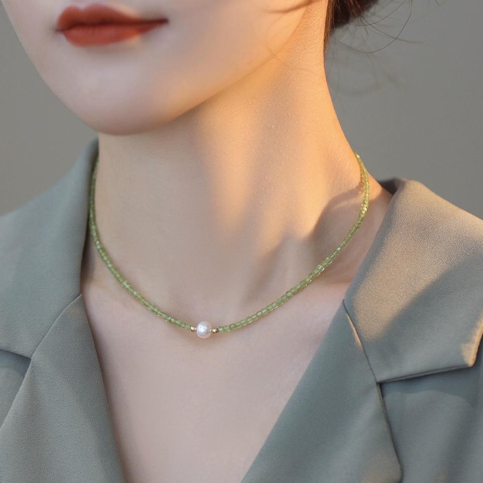 Emerald Olivine Freshwater Pearl Necklace Light Luxury Retro Style Niche Pendant Collarbone Chain Simple Versatile for Women