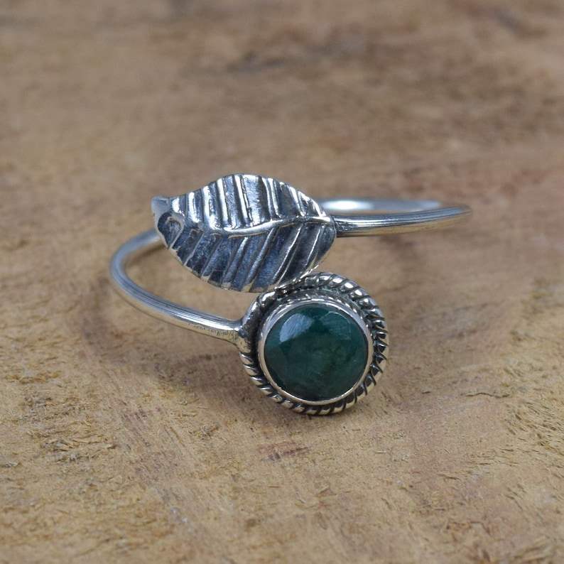 Bague en argent sterling émeraude, style feuille, bande réglable, bijoux en pierres précieuses faits à la main, cadeau élégant pour femmes