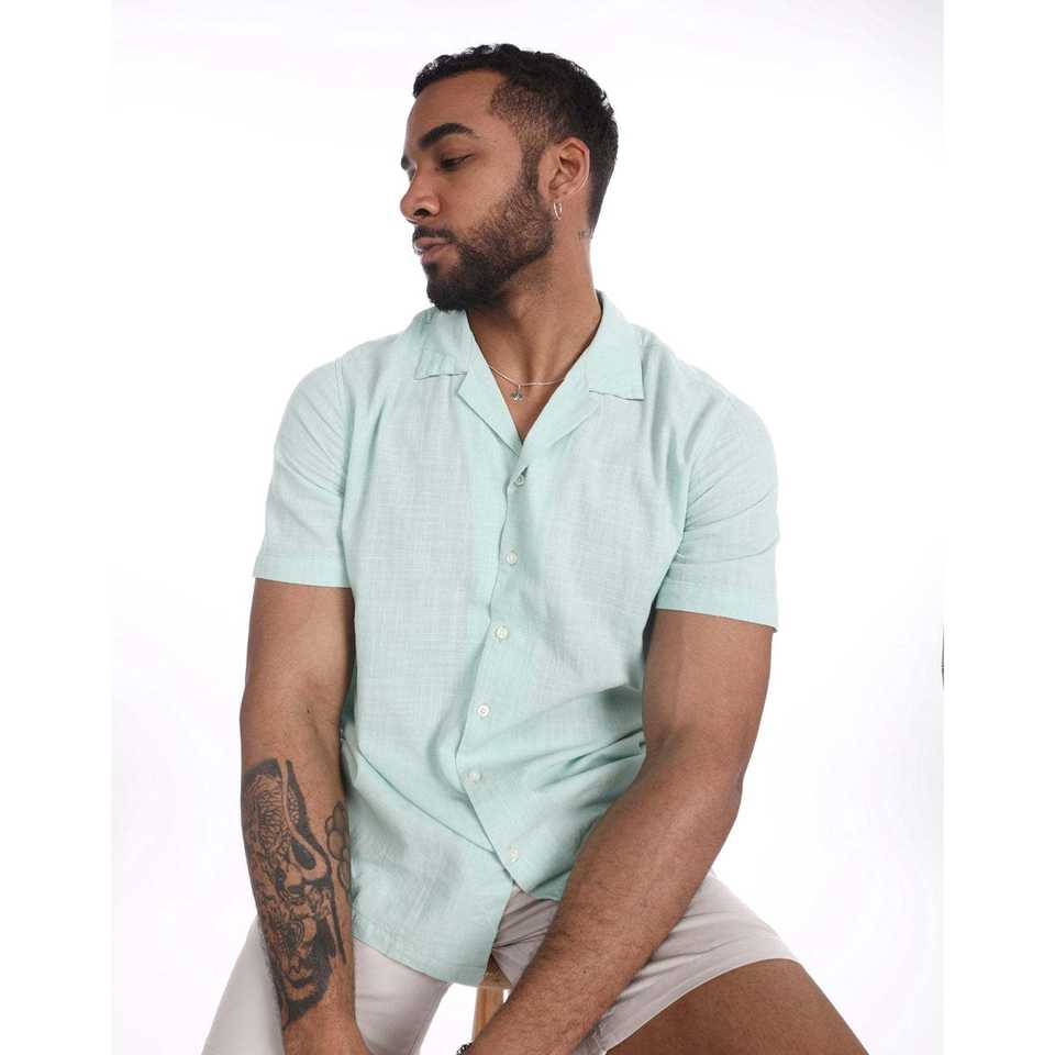 Taille Empire et coupe régulière Col de chemise ouvert et fentes latérales Chemise hawaïenne en coton vert d'eau pour homme