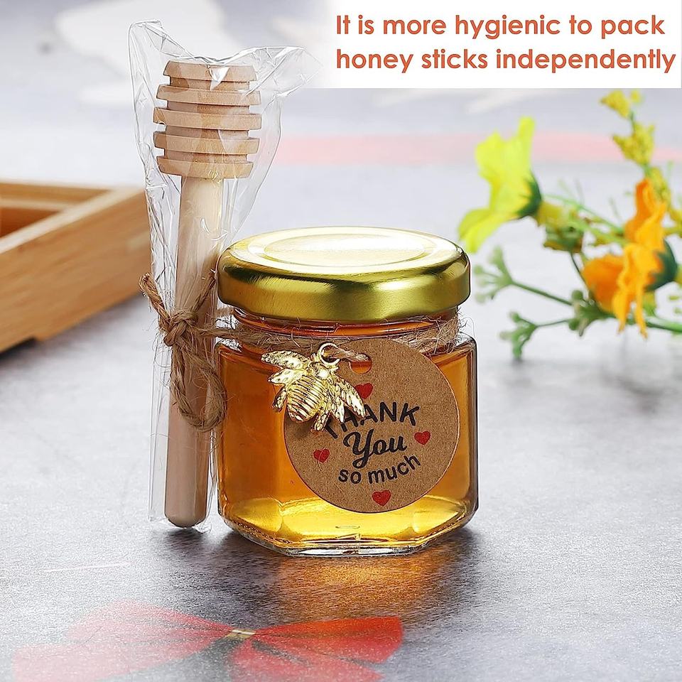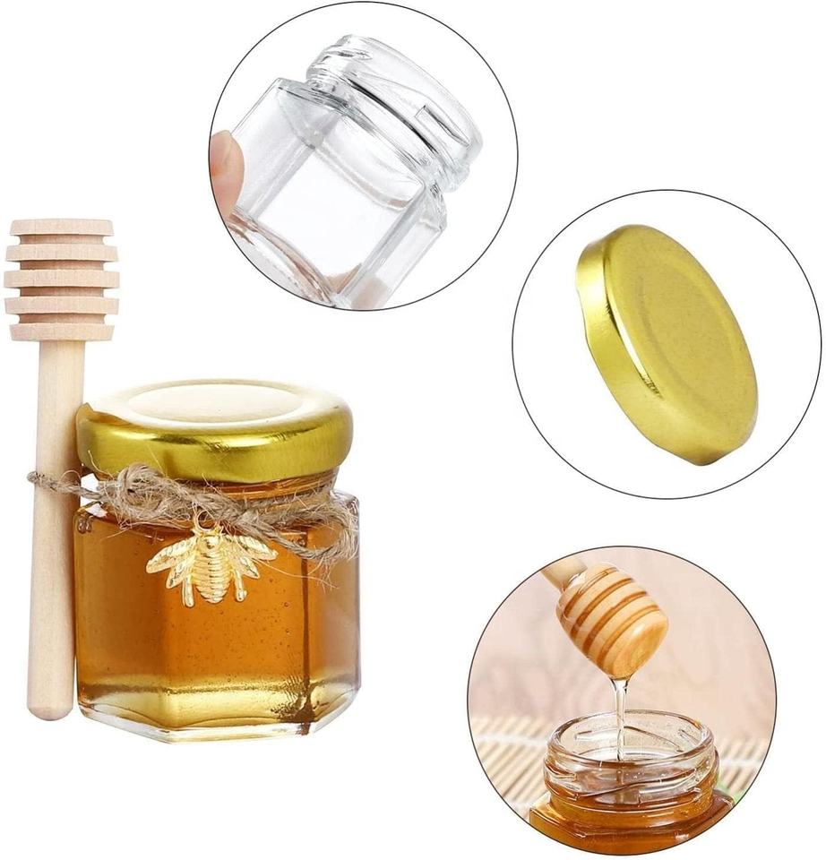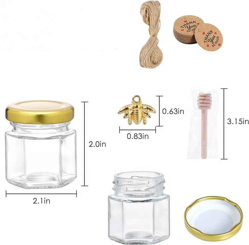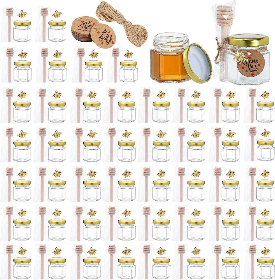 Lot de 50 mini-pots à miel hexagonaux en verre vides de 45 ml avec cuillère, petits pots à miel pour cadeaux de naissance, de mariage et de fête