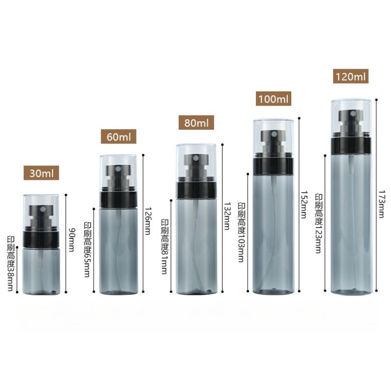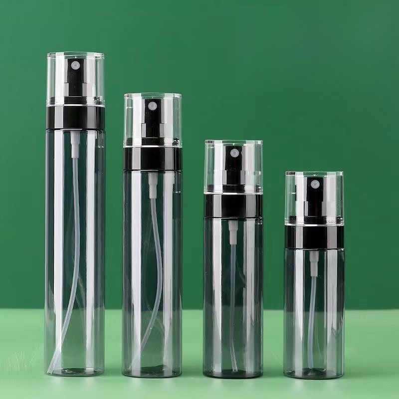 Flacon pulvérisateur de voyage vide transparent noir 30ml 60ml 100ml 120ml en PET avec pompe, pour lotion, brume fine, hydratant pour le visage