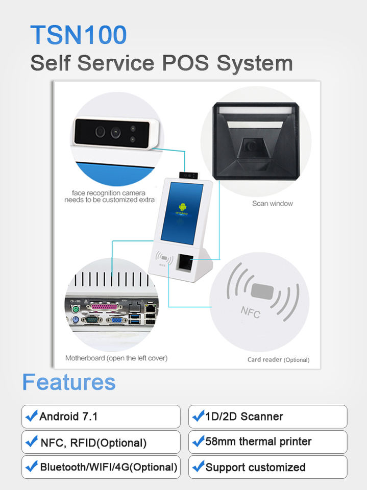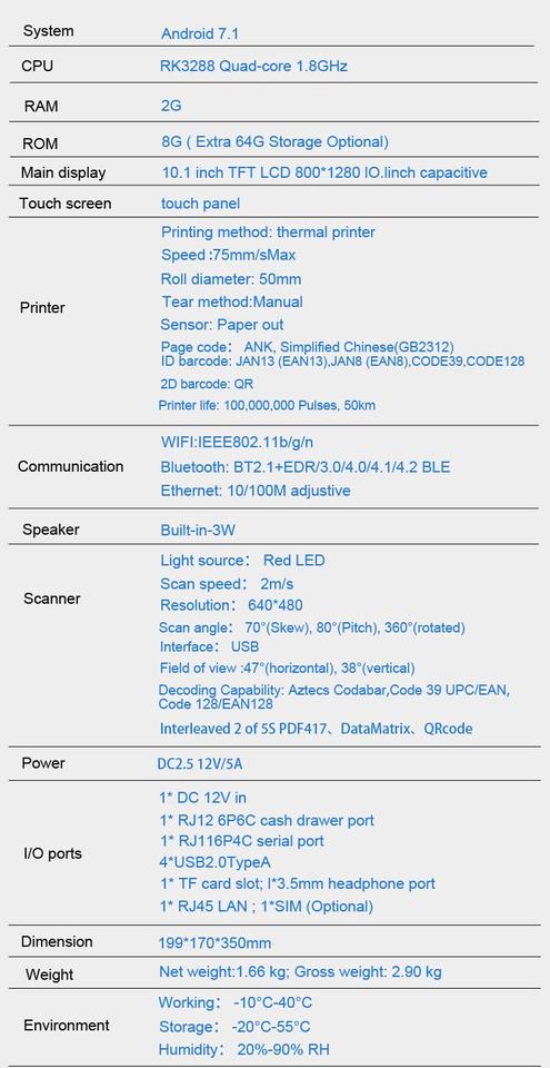 Ports:Fente pour carte de TF et de SIM (facultative), tiroir-caisse de RJ12 6P6C, RJ11, LAN RJ45, USB