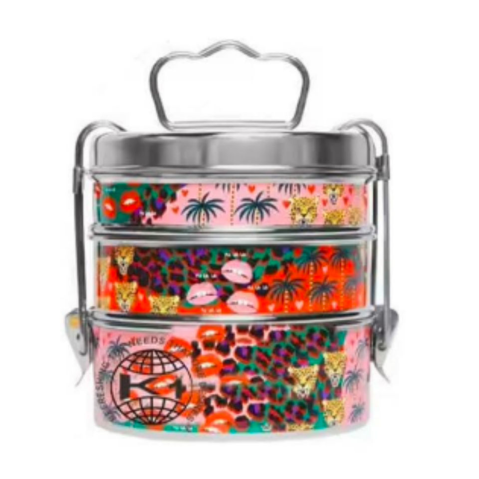 Émail imprimé en acier inoxydable à 3 niveaux Clip Lock Tiffin Vibrant Mughal Pattern, Office/School Picnic Carrier