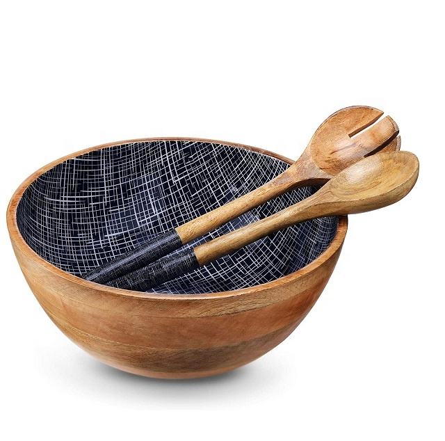 Bol en bois d'acacia de forme ronde avec cuillère à salade, motif émaillé, nouveau design, vaisselle pour mariages et fêtes.