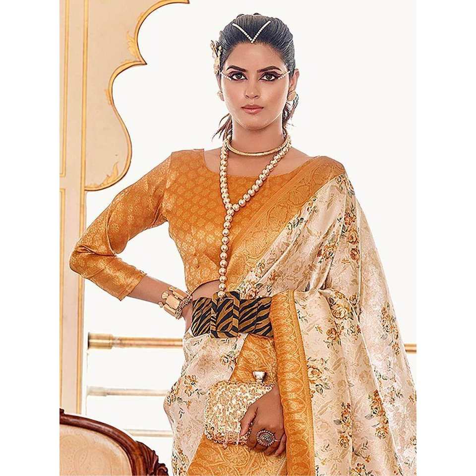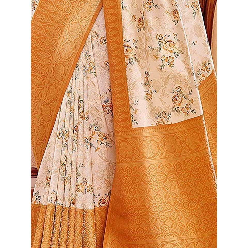Sari en soie douce à imprimé floral blanc cassé enchanteur pour les festivals et les mariages