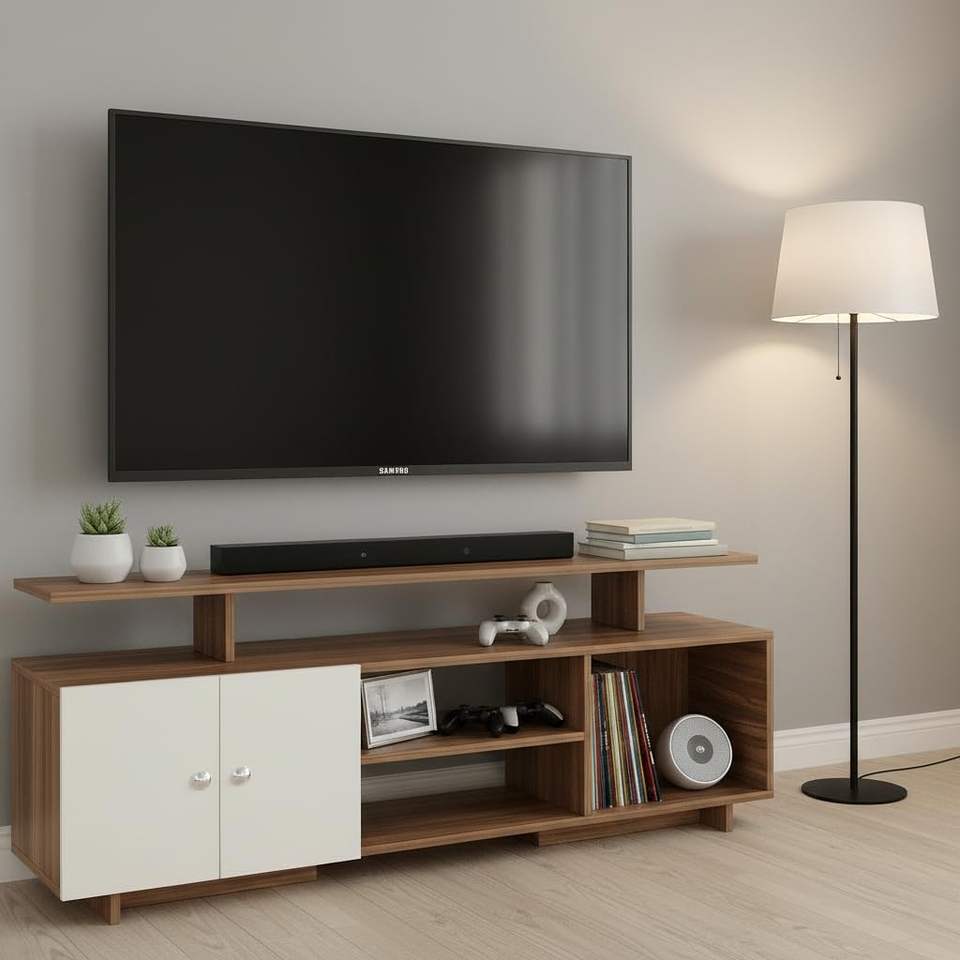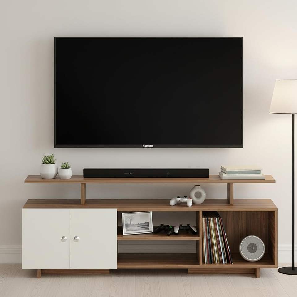 Meuble TV en bois d'ingénierie, meuble TV sur pied avec étagères de rangement pour salon, (teck exotique et blanc)