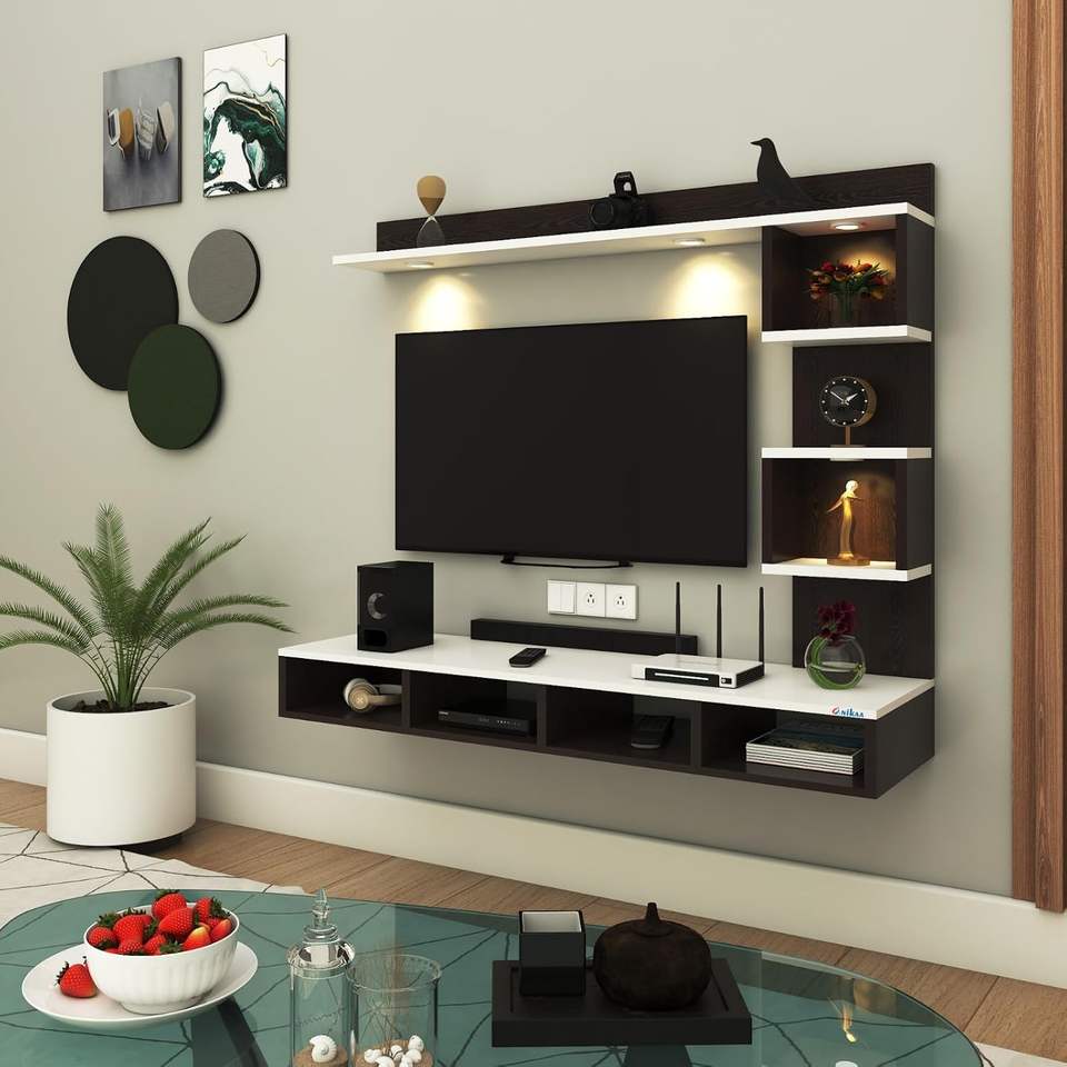 Meuble TV mural en bois d'ingénierie avec éclairage LED, meuble de divertissement TV, support pour décodeur (Wengé/Blanc)