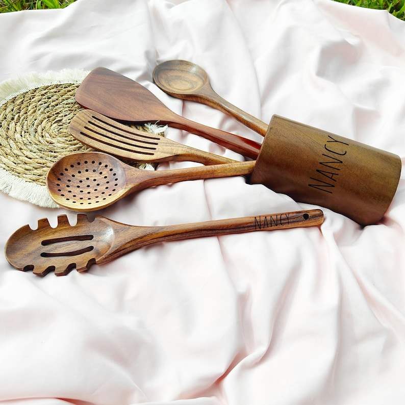Ustensiles de cuisine gravés, spatule, cuillère, pelle à pâtes, ensemble d'ustensiles de cuisine en bois personnalisés, cadeaux