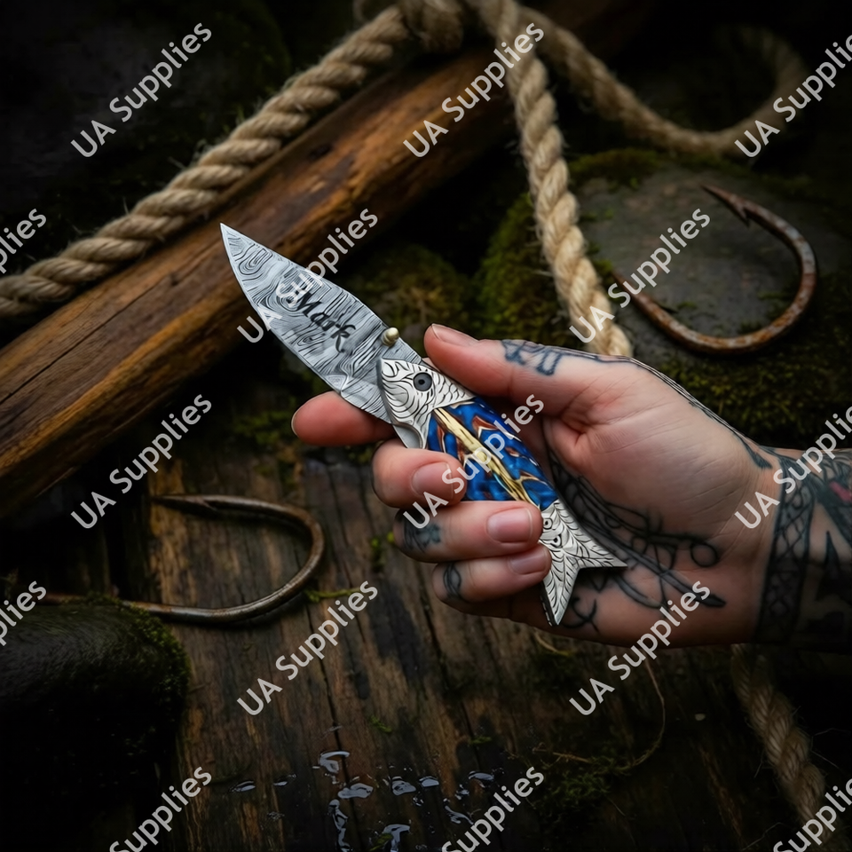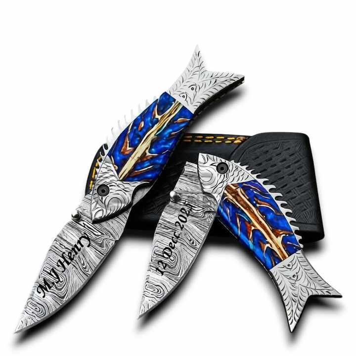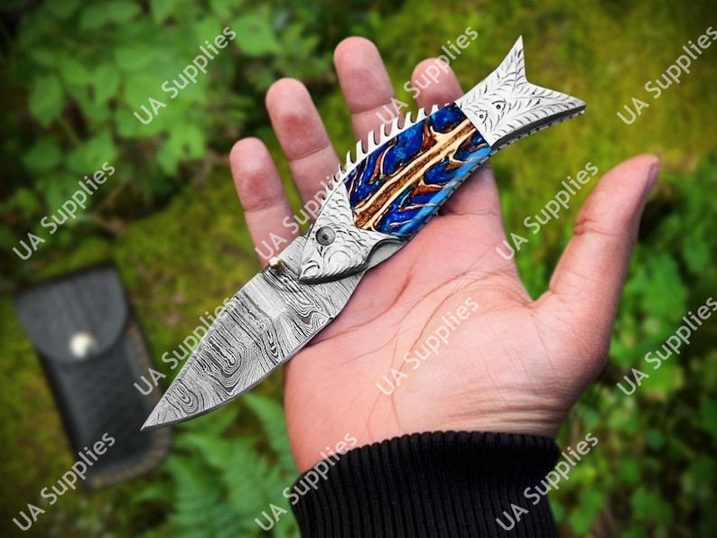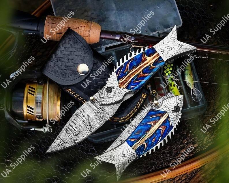 Couteau de camping multi-usage EDC en acier Damas gravé, avec manche en forme de cône de pin, pointe tombante, 7,5 pouces, idéal pour la pêche