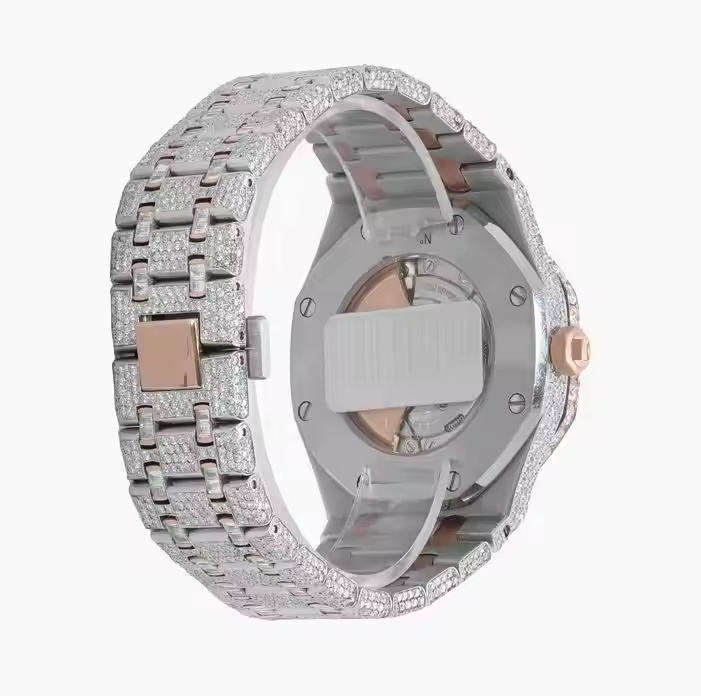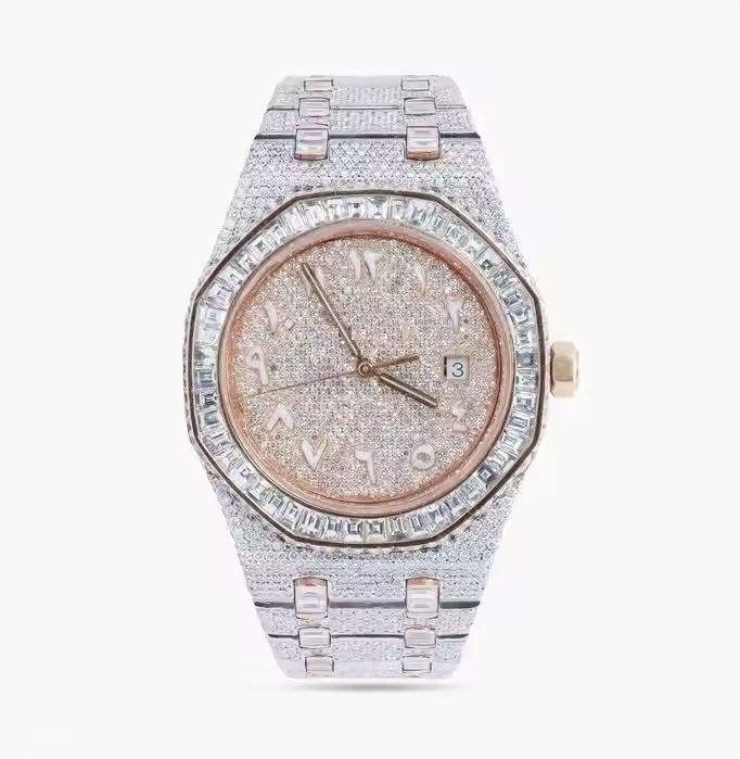 Montre en acier inoxydable de style hip-hop de luxe avec cadran en cristal de verre, boîtier de 41 mm, bouton poussoir, fermoir caché, résistante à l'eau
