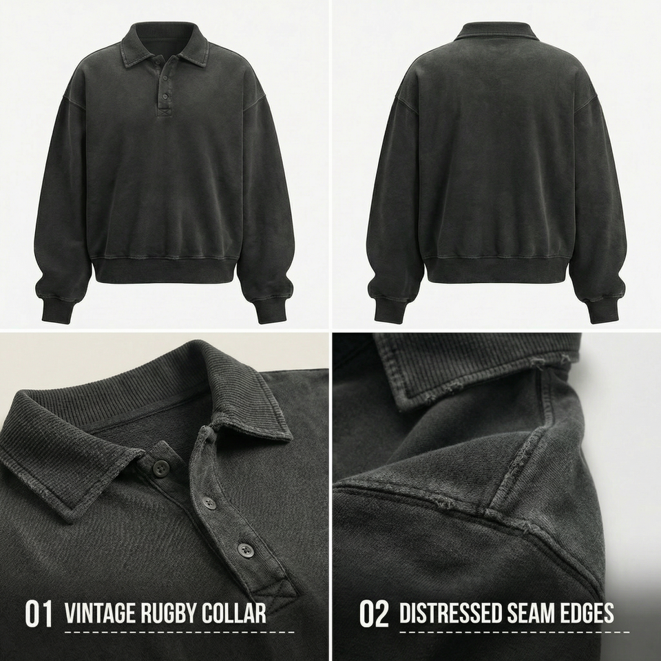 Sweat-shirt rétro délavé aux enzymes, noir vintage décoloré, en molleton de coton, coupe oversize, col rugby, épais, style sportswear, sans motif