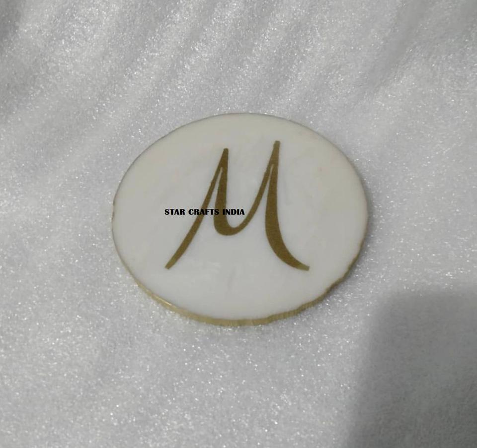Sous-verre en résine époxy avec finition en or antique Conception d'alphabets Forme ronde Qualité supérieure pour servir des boissons Prix de gros