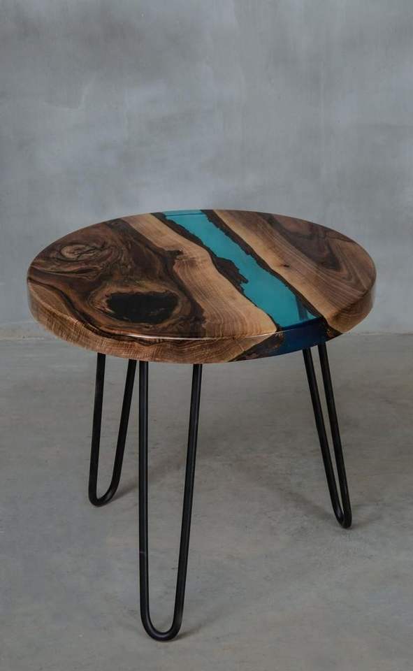 Table basse ronde en bois massif avec résine époxy, bord naturel, design contemporain, structure métallique, table d'appoint pour la maison