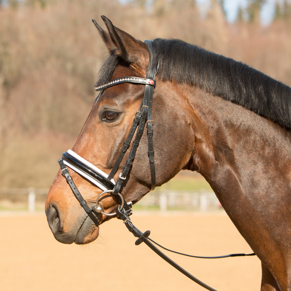 Bride équestre brevetée conçue avec un confort de pièce de couronne rembourré doux avec un design de dos coupé pour un confort d'oreille supplémentaire.