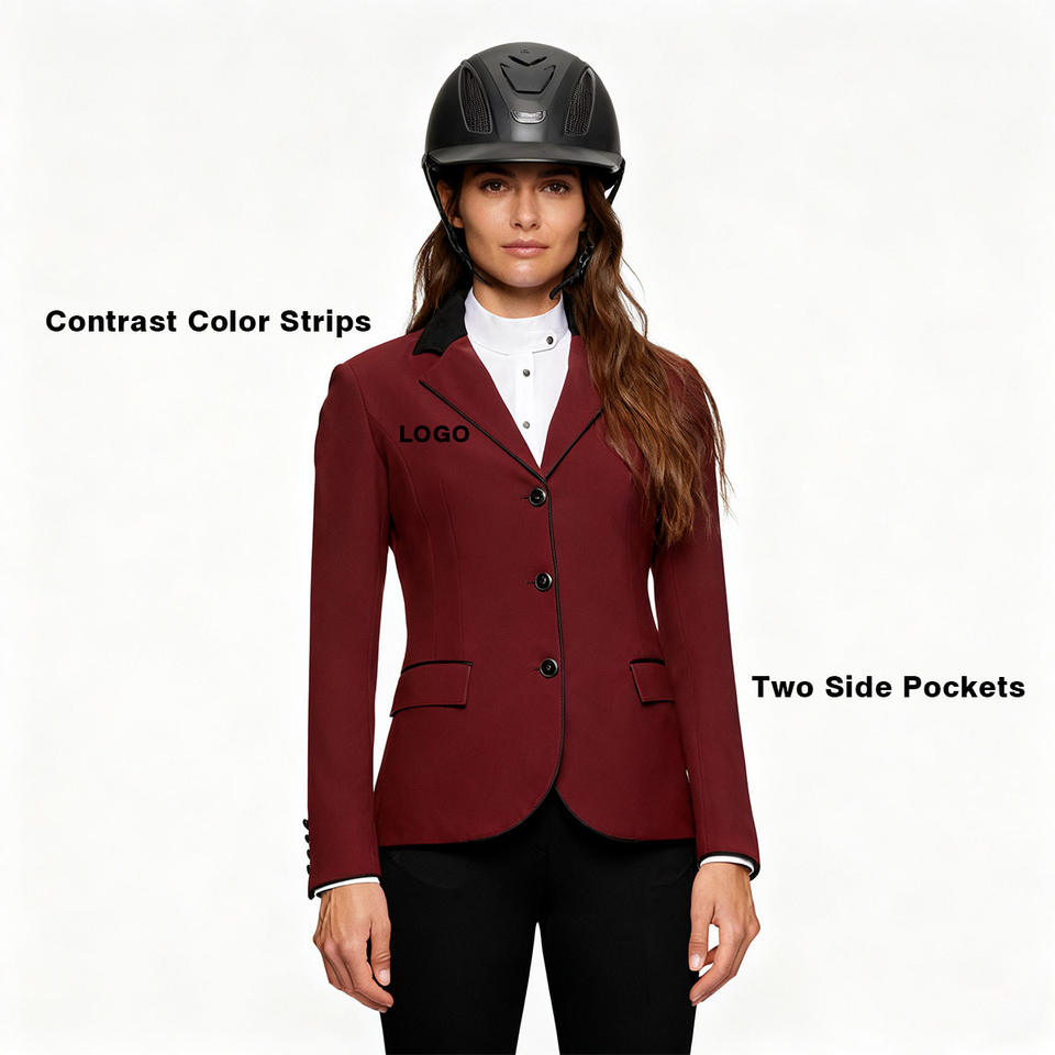Veste d'équitation rouge pour concours, vêtements d'équitation avec bandes contrastées, manches longues, poches latérales, veste d'équitation de compétition