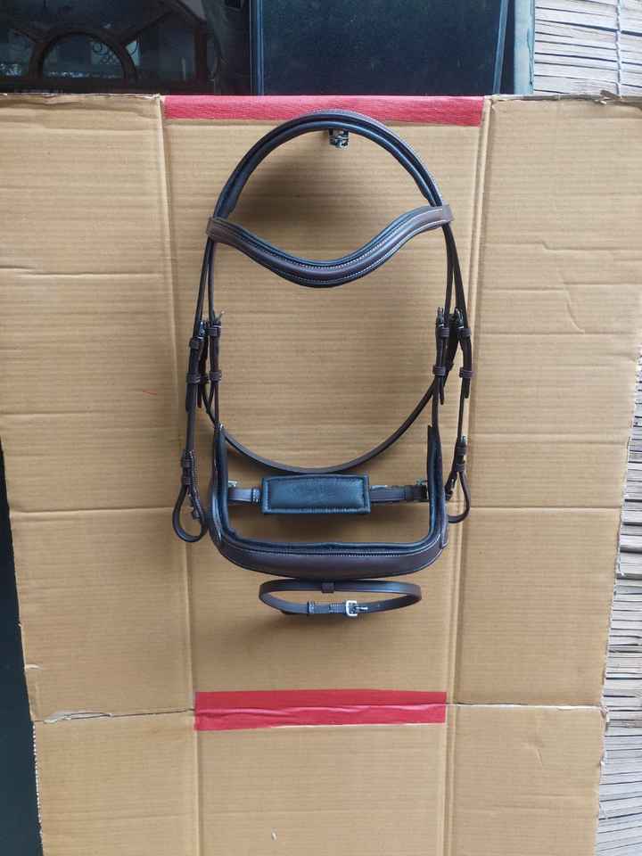 Bridon de saut pour cheval en cuir végétal équestre, anatomique, rembourré et surélevé, avec un design à surpiqûres fantaisie, équipement équestre