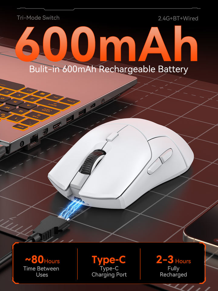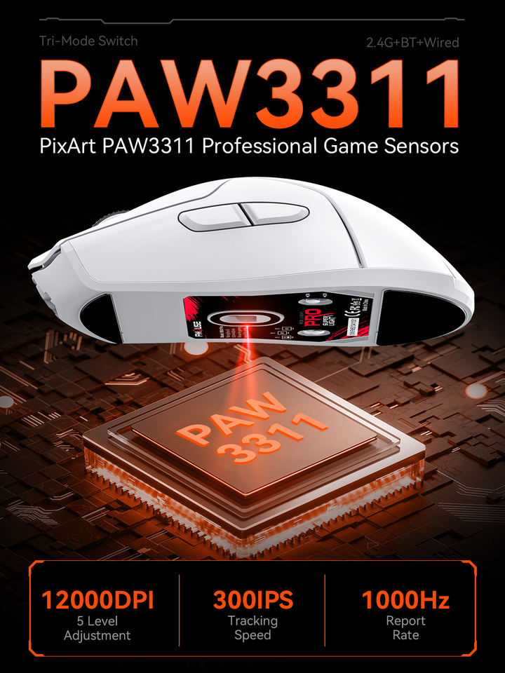 Souris de jeu sans fil ergonomique avec capteur Paw3311, rechargeable par USB-C, 6 boutons programmables, touches latérales pour PC/ordinateur portable/Mac