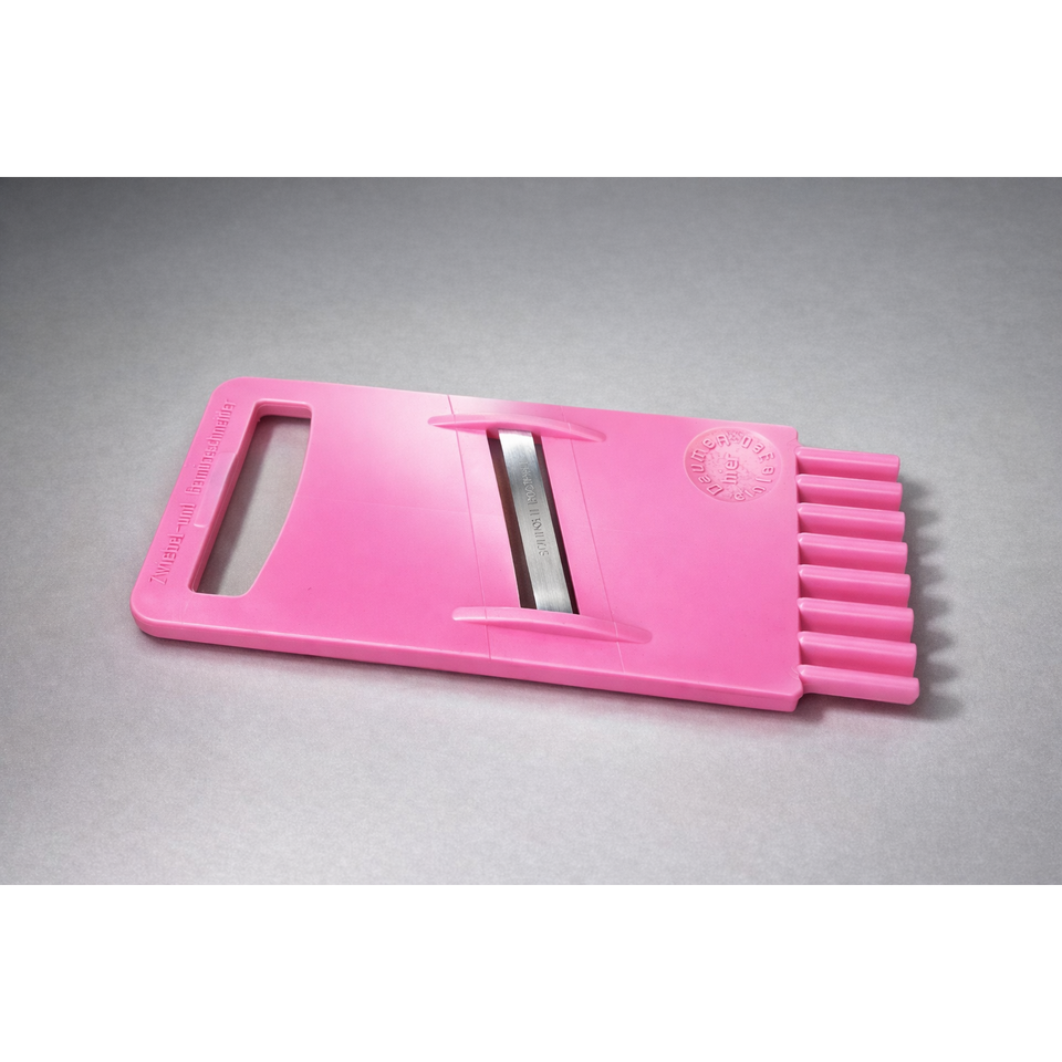 Râpe à légumes rose avec lames en acier inoxydable et design ergonomique