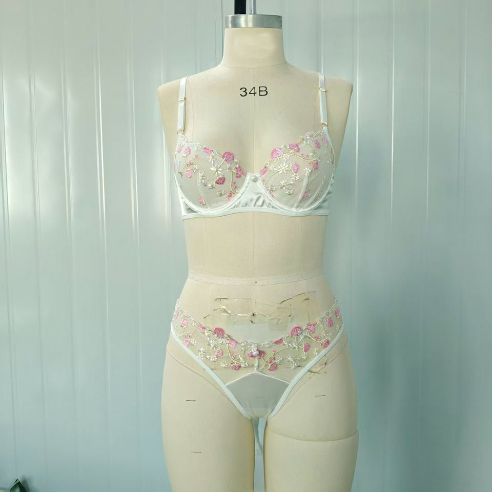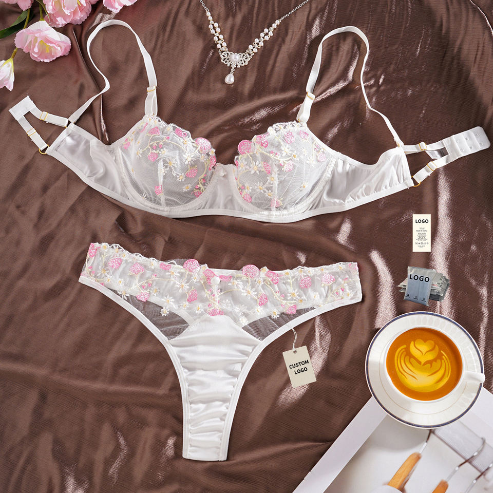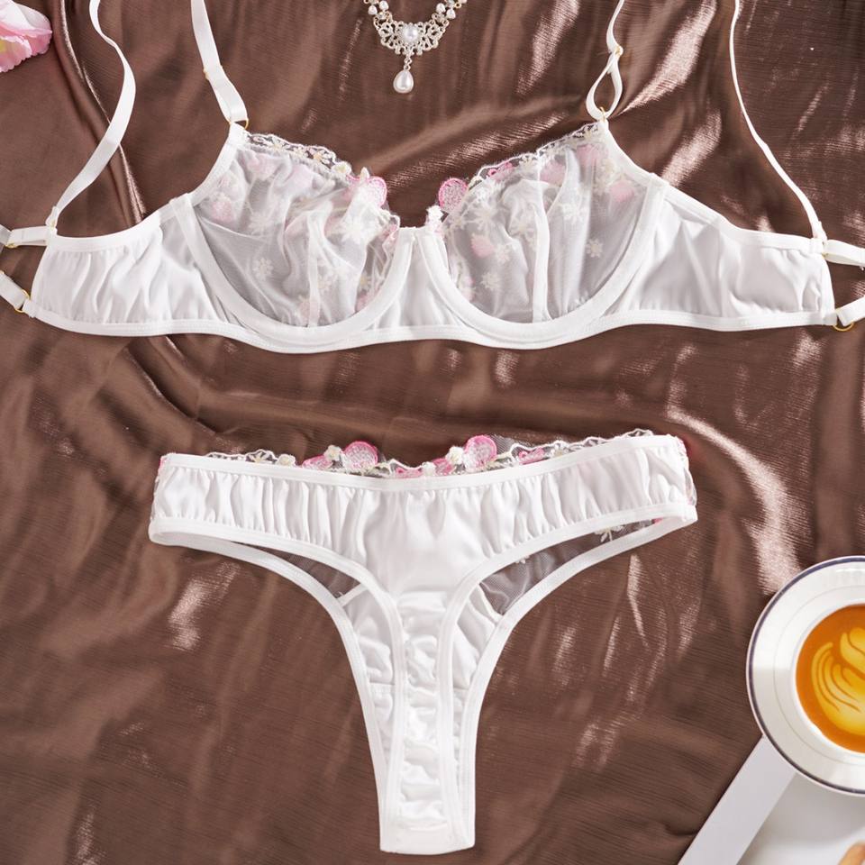 Ensemble de lingerie sexy en dentelle blanche transparente à motif floral, lingerie en maille érotique, ensemble soutien-gorge et culotte transparents pour femmes