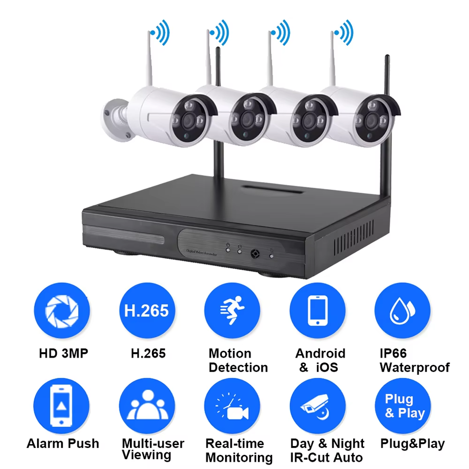 Kit de caméra de sécurité CCTV sans fil Eseecloud WIFI 4CH 8CH NVR, vision nocturne 3MP, grand angle, détection de mouvement humain H.265, alarme