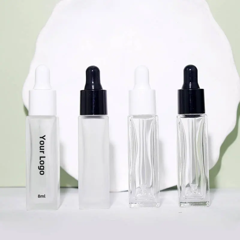 Nom du produit:Flacons compte-gouttes en verre clair dépoli carré 3ml 5ml 8ml bouchon noir