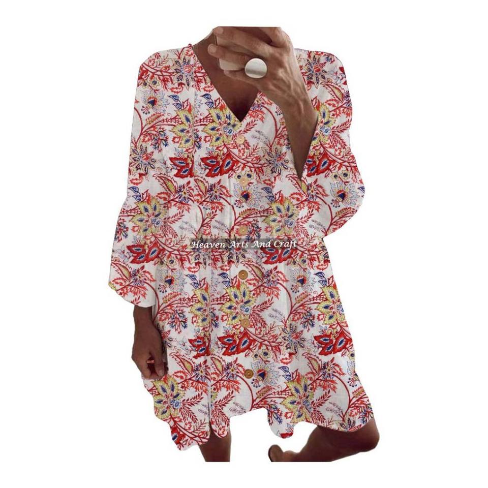 Tunique en coton imprimée à la main, éthique, légère, tissée, pour femme, style bohème chic, artisanat indien.
